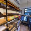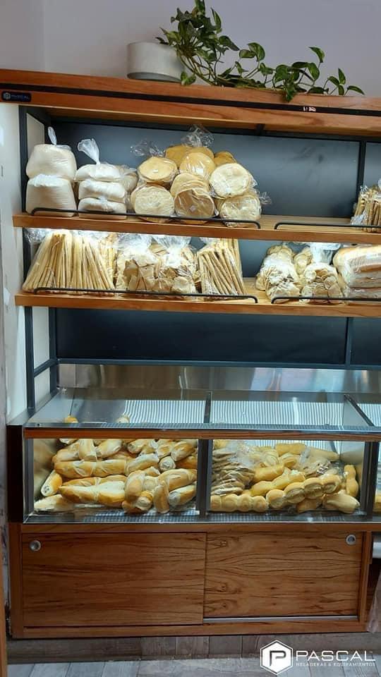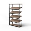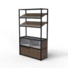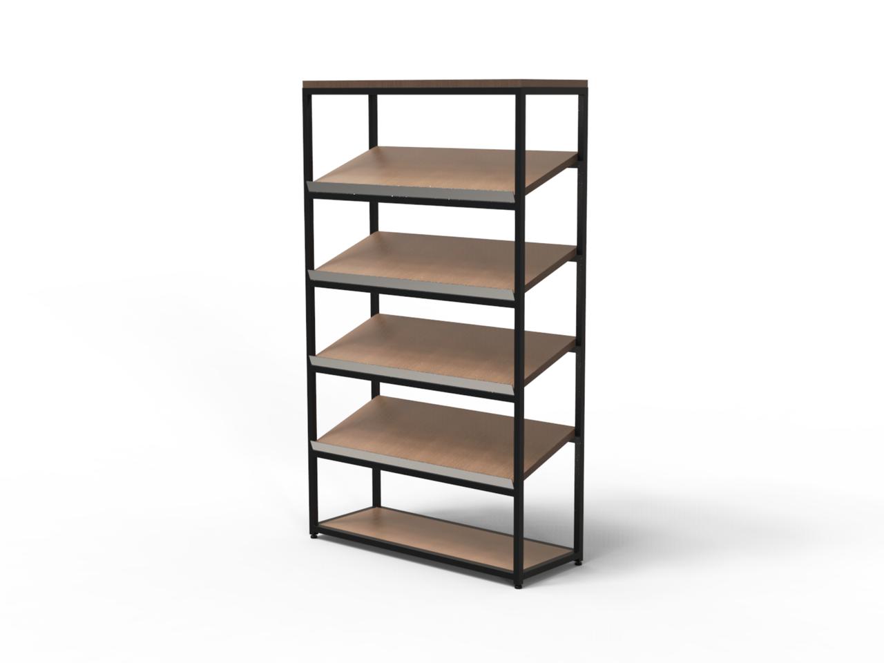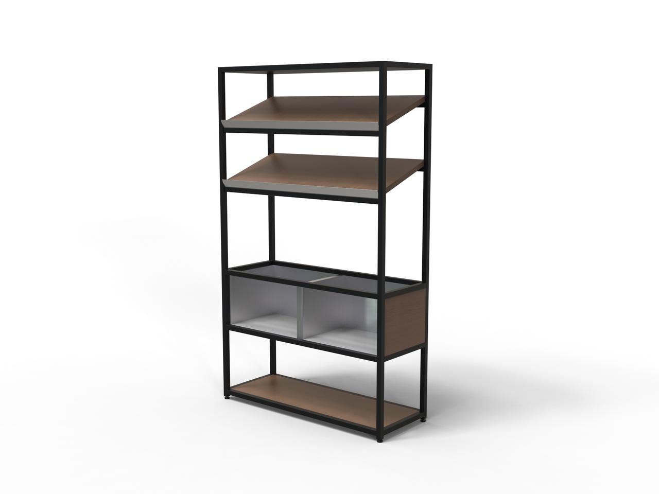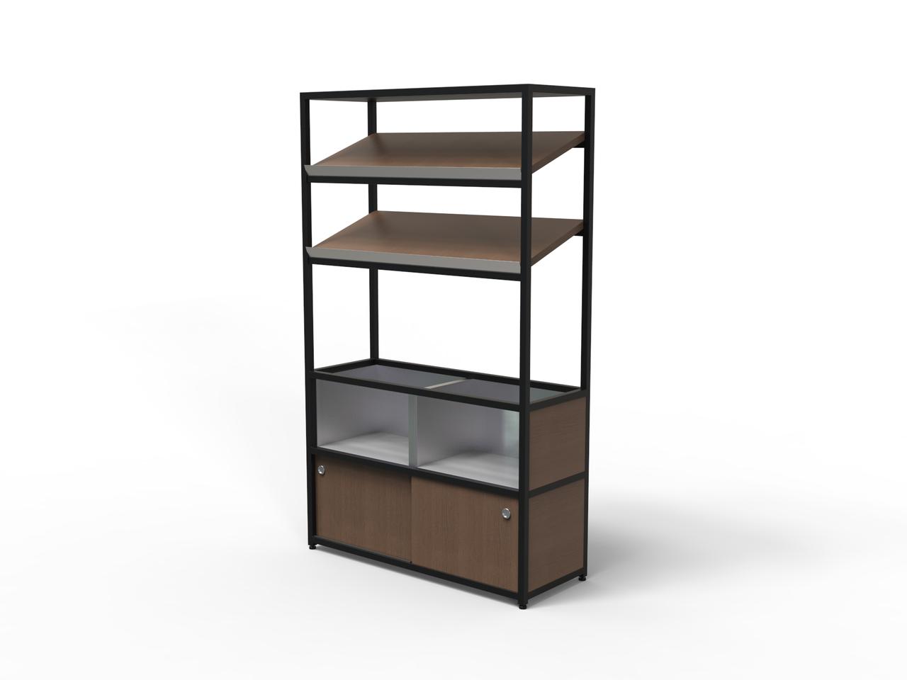 Mueble vertical fabricado en estructura de caño 30×30 negro. Cenefa superior iluminada o con moldura ciega. Estantes de madera con frente en acero con inclinación con tope y apoyo para bandejas. Luz led debajo de cada nivel de exhibición. Sector inferior de guardado con puertas o abierto con estantes.